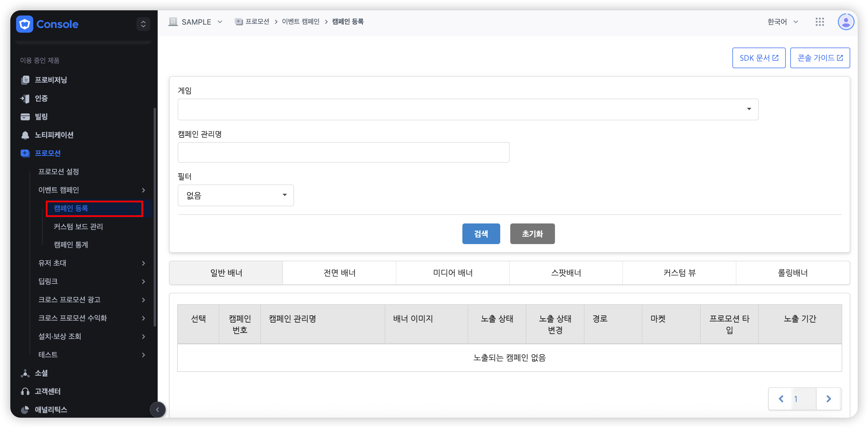- 언어 : 선택한 언어에 배너가 등록되어있는 것만 필터링하여 리스트에서 보여줍니다. 예를 들어 한, 영, 일에 배너를 등록한 캠페인은 중국어로 필터링했을 때 검색되지 않습니다.
