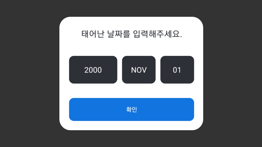 AuthV4.checkAgeGate는 사용자에게 생년월일 정보를 입력할 수 있는 팝업을 노출합니다. 사용자는 팝업의 연/월/일 항목에서 본인 생년월일을 선택할 수 있습니다. 사용자가 입력을 완료하면 AuthV4.checkAgeGate는 그 값(yyyy-MM-dd 포맷)을 콜백으로 반환합니다.
