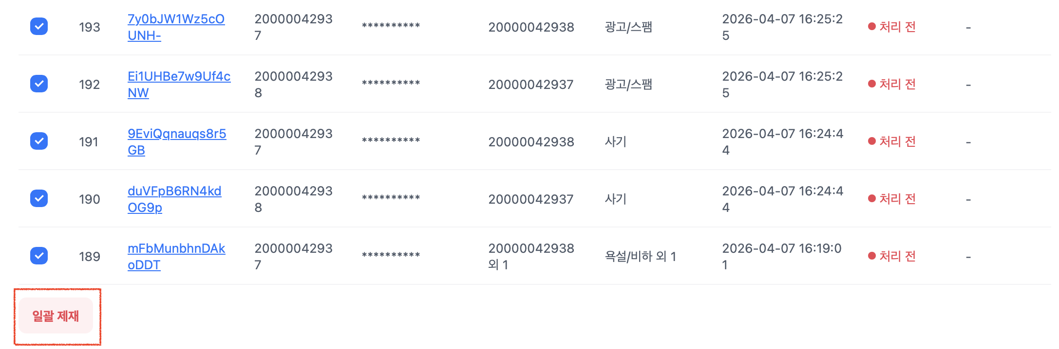 제재가 필요한 신고 내역들을 선택하여 제재 처리를 한 번에 완료할 수 있습니다.