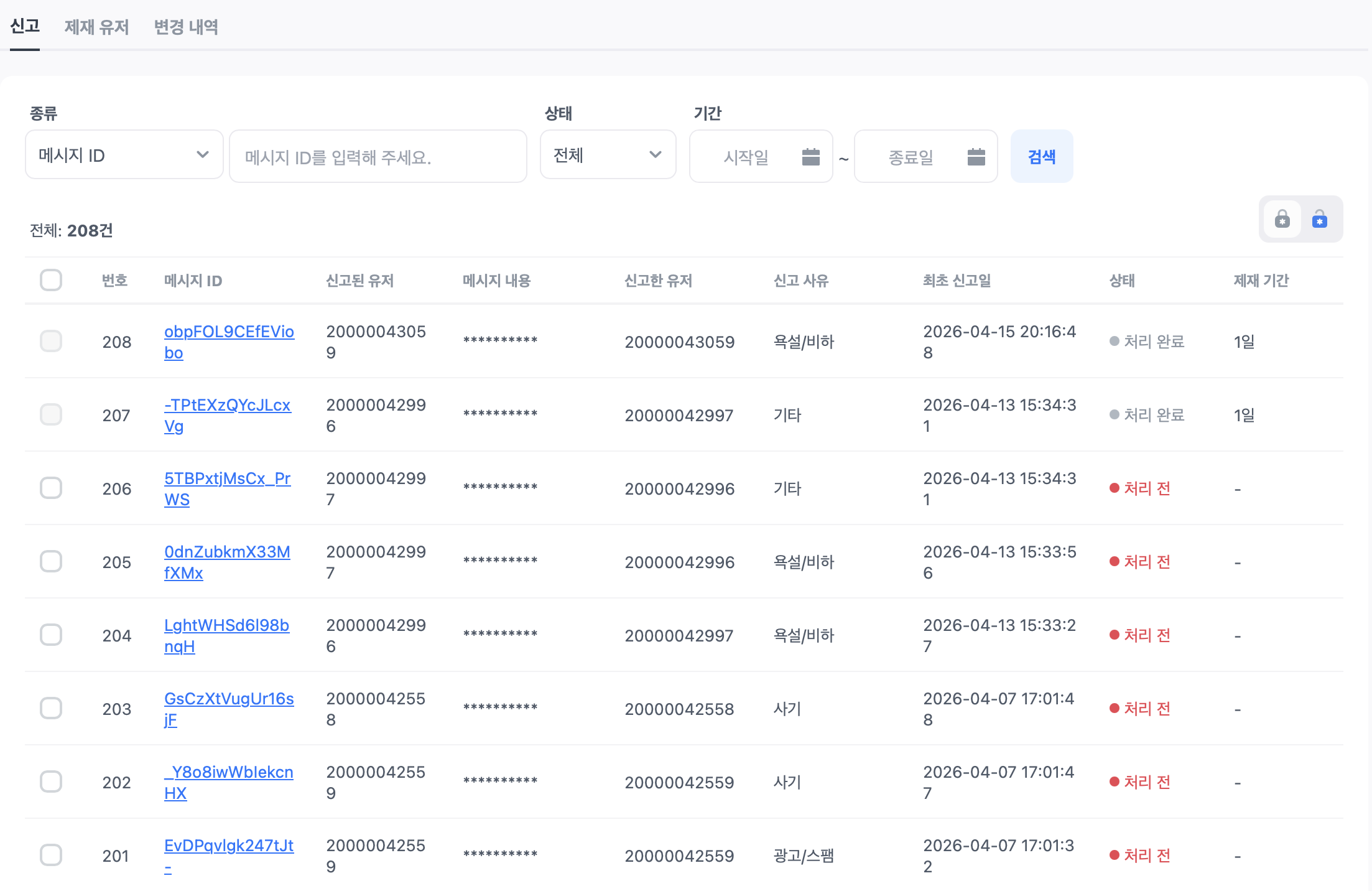 - 최초 신고일 : 하나의 메시지를 여러 유저가 신고할 수 있기 때문에 여러 개의 신고 중 가장 처음 접수된 신고 날짜가 표시됩니다.