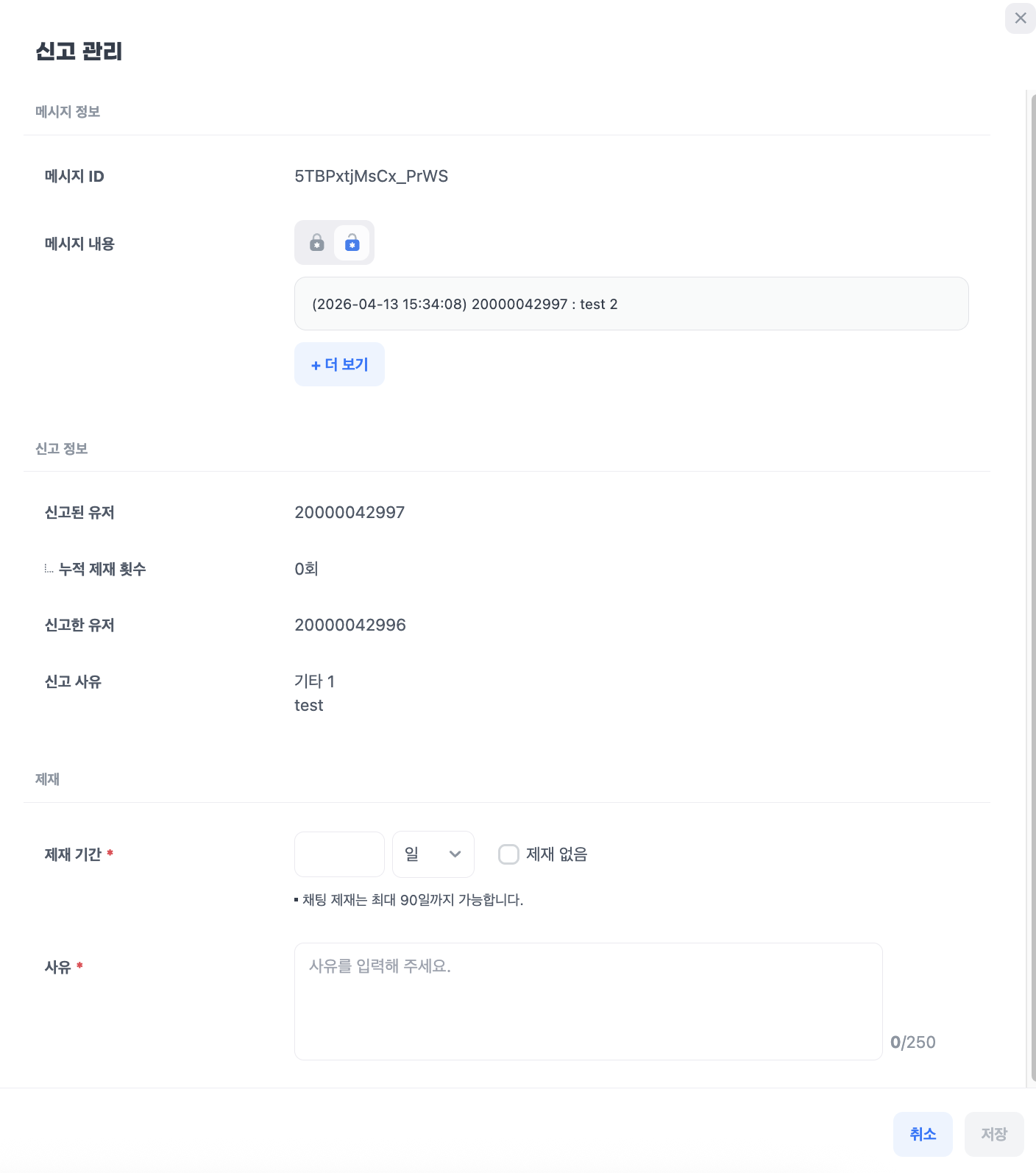 신고 내역을 확인해 해당 메시지를 전송한 유저를 제재할 수 있습니다.