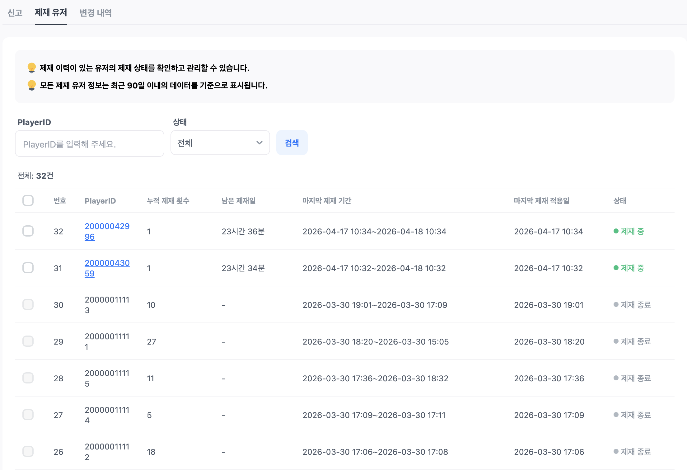 이미 제재된 유저들의 제재 상태를 확인하고 기간을 조정하거나 제재를 종료할 수 있습니다. 모든 제재 정보는 최근 90일 이내의 데이터를 기준으로 표시됩니다.