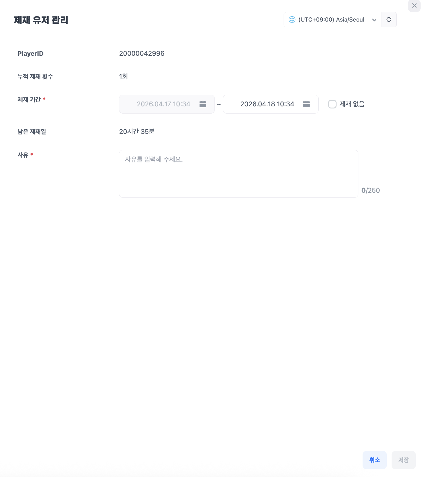 현재 제재 중인 유저를 특정하여 기존 제재 기간을 변경하거나 제재를 즉시 종료할 수 있습니다.
