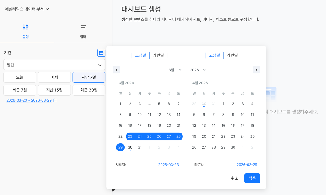 날짜 범위 선택시 빠른 선택 버튼을 활용하거나, 달력 버튼을 통해 직접 날짜를 선택할 수 있습니다.