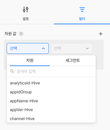 필터의 차원에 표기되는 항목은 패널을 구성하는 데 사용된 모든 이벤트의 속성이 노출됩니다. 특정 패널에 해당 속성이 없는 경우, 그 패널에는 필터가 적용되지 않습니다.