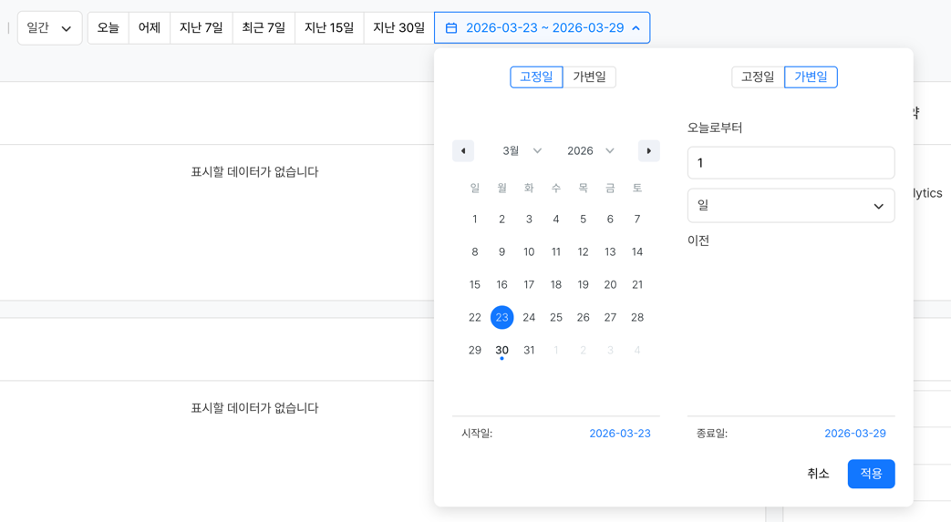 조회 화면에서 날짜 범위를 변경하면 대시보드 내 모든 패널에 일괄 적용됩니다. 빠른 선택 버튼(예: 지난 30일) 또는 직접 날짜를 입력하여 설정할 수 있습니다.