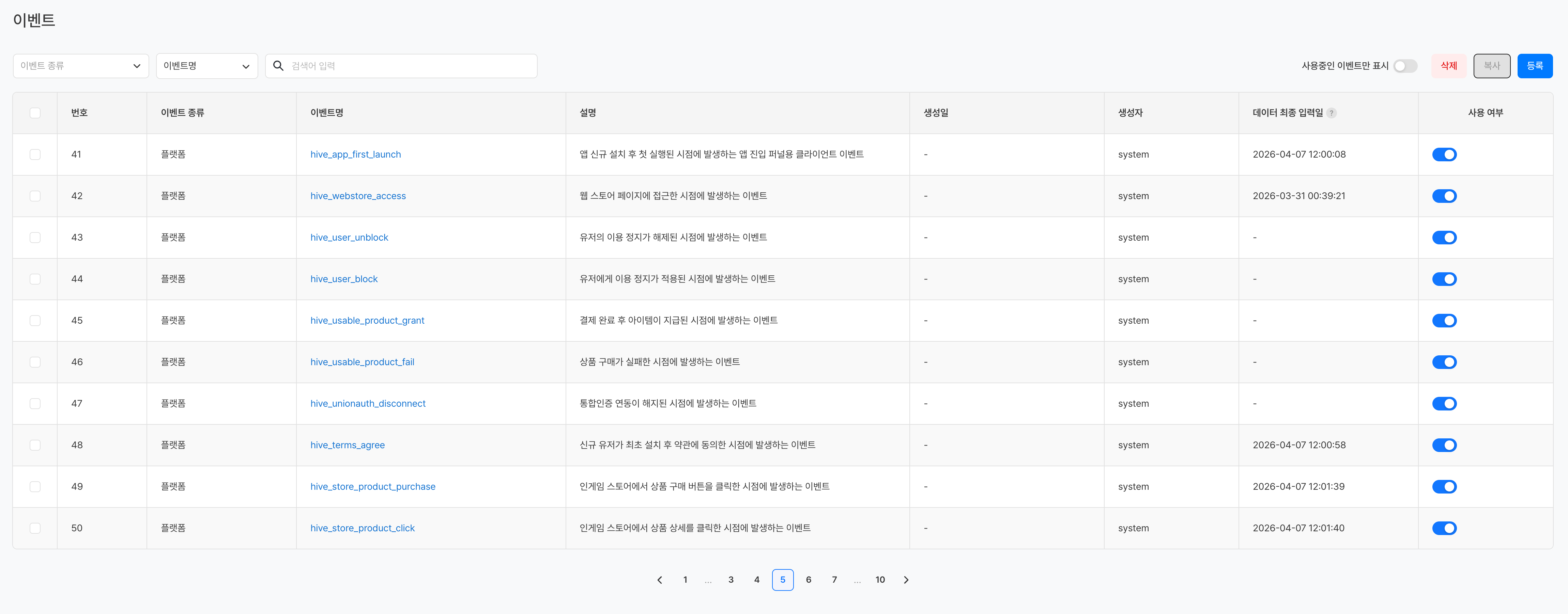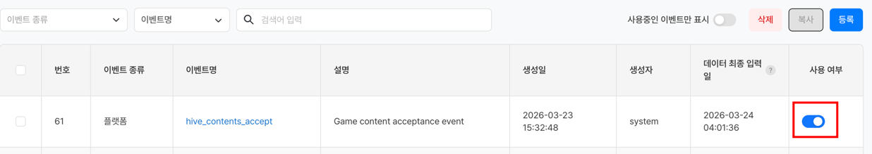 | 사용중인 이벤트만 표시 | 토글 ON 시 사용 여부가 활성화된 이벤트만 표시 |