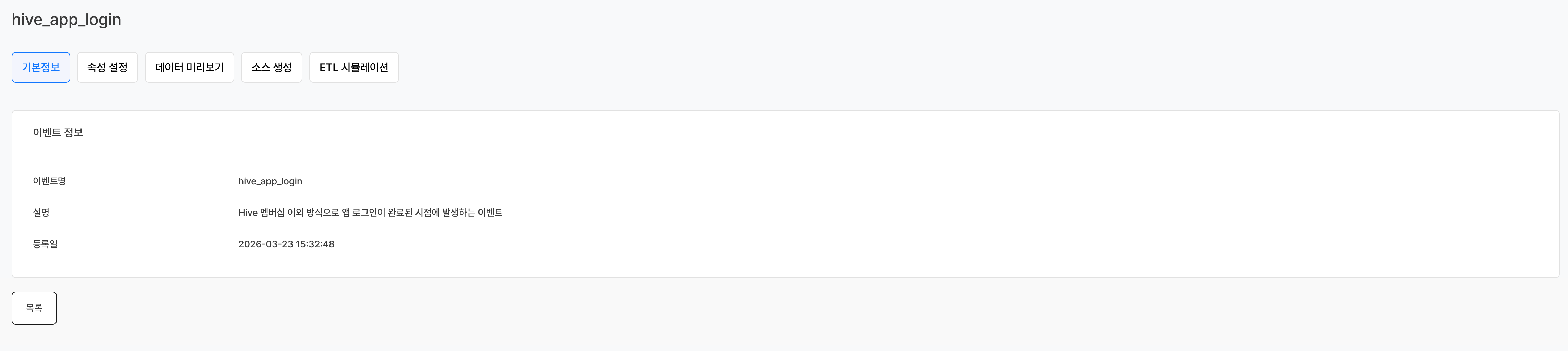 | 데이터 최종 입력일 | 해당 이벤트의 데이터가 마지막으로 수집된 일시. 10분 단위로 동기화되며, 수집 이력이 없으면 -로 표시 |
