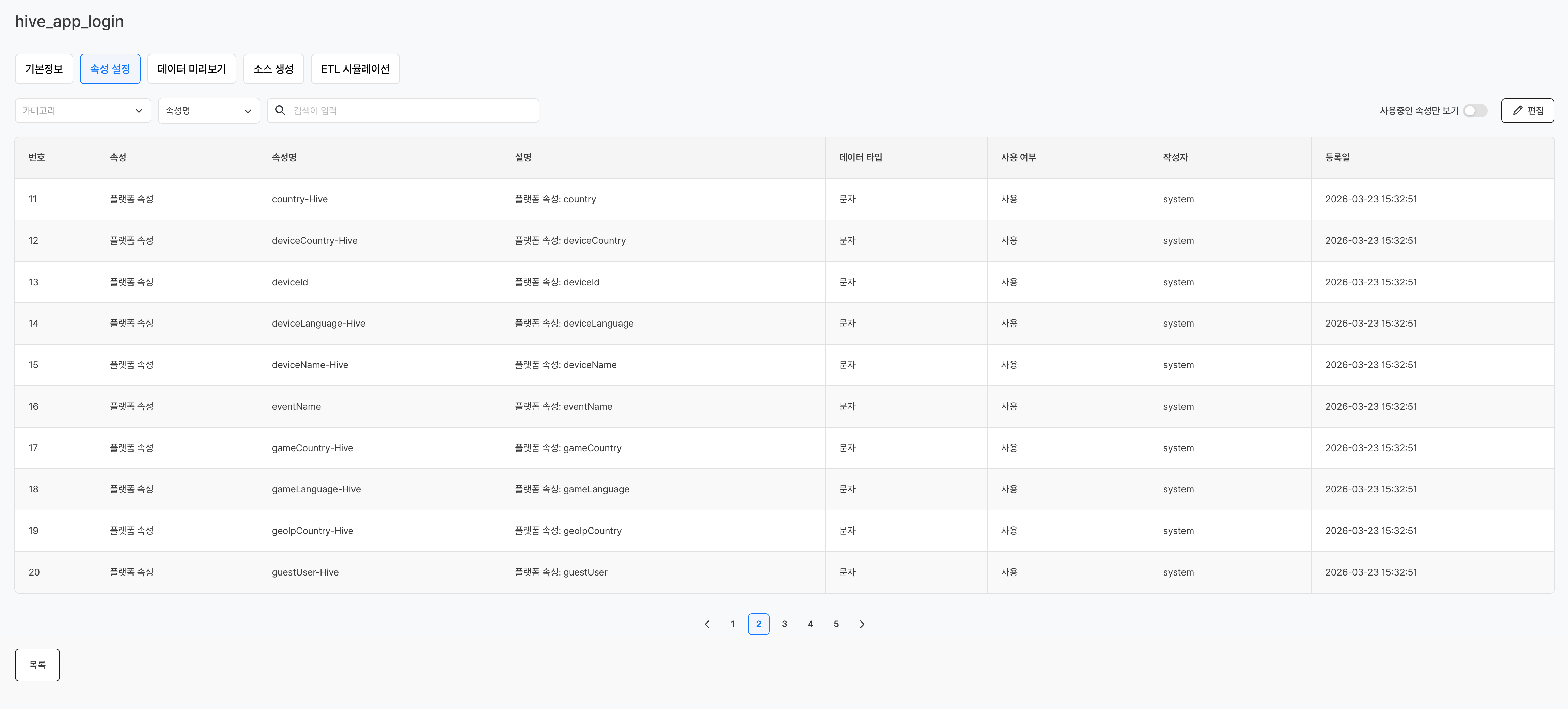 | 플랫폼 속성 | SDK 연동만으로 Hive에서 기본으로 수집하는 속성(예: 국가, 마켓, 서버 ID, OS 등) |
