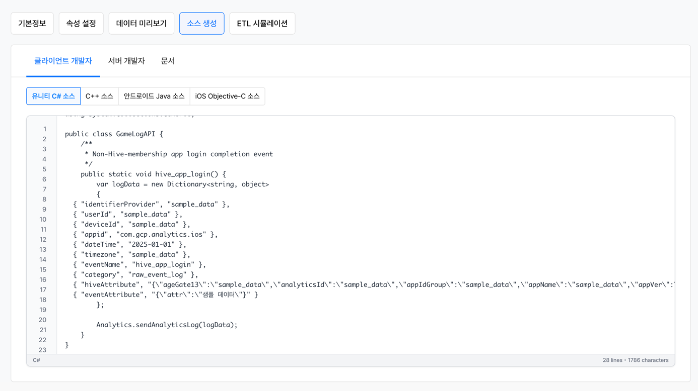 해당 이벤트를 애널리틱스로 전송하기 위한 소스 코드를 자동으로 생성합니다. 개발자가 별도로 코드를 작성하지 않아도 이 탭에서 생성된 소스를 그대로 사용해 데이터를 전송할 수 있습니다.