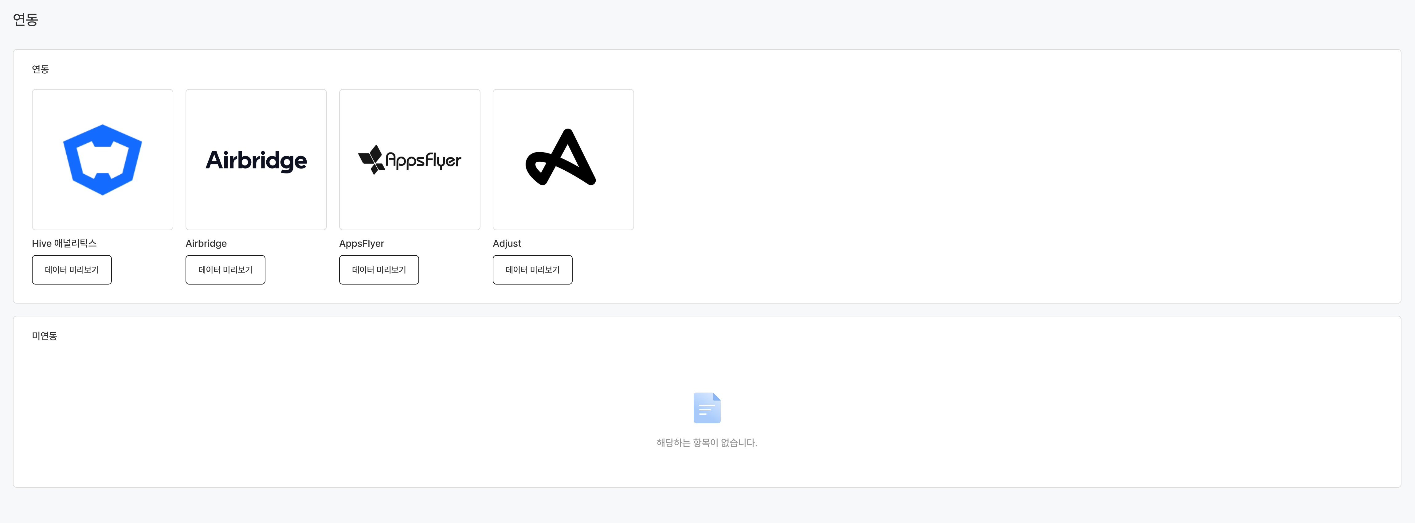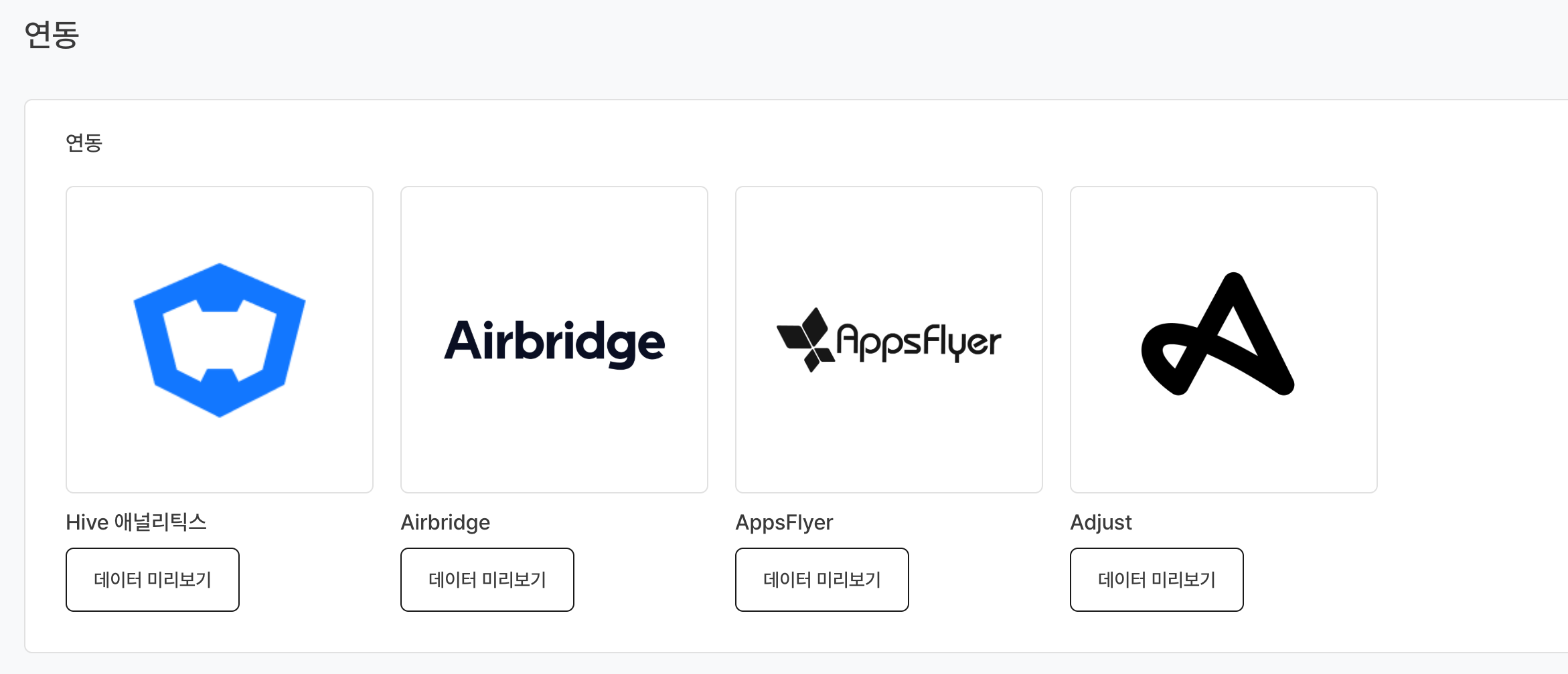 연동은 MMP(Mobile Measurement Partner) 등 애널리틱스와 연동할 수 있는 써드파티 툴 목록을 확인하고, 이벤트 데이터 수집 현황을 확인하는 기능입니다.