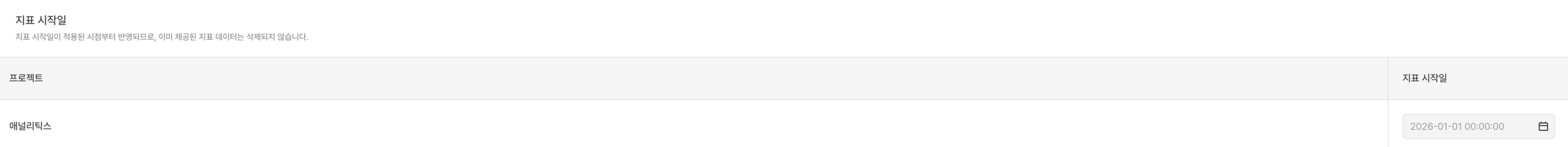 - 지표 시작일을 변경하면 기존 차트와 대시보드의 데이터 수치가 변경될 수 있습니다. 변경 전 팀과 충분히 협의하세요.
