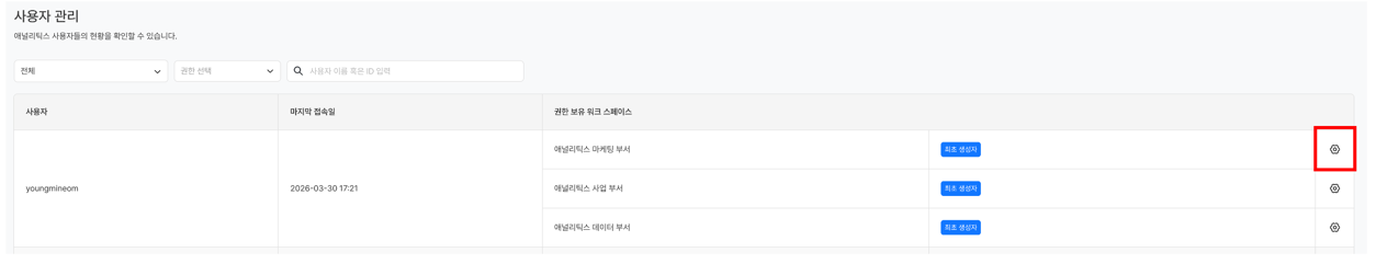 - 권한을 변경할 사용자의 워크스페이스 우측 설정 버튼을 클릭합니다.