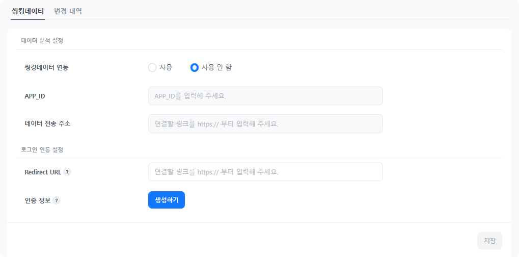- 인증 정보 : '생성하기' 버튼을 클릭하여 Client ID와 Client Secret을 발급받습니다. 발급된 정보는 씽킹데이터 측에 전달하여 로그인 연동 설정을 완료해 주세요.