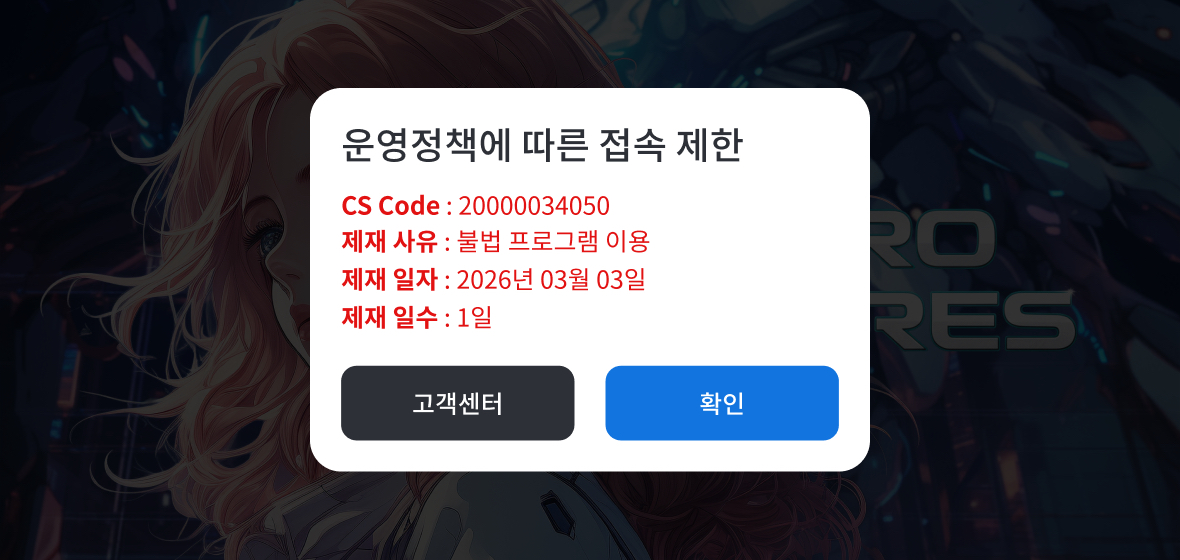 - 운영정책 제한 : 운영 정책에 따라 계정 접속이 제한된 경우 노출되는 팝업입니다. 팝업 타이틀은 고정된 문구로 표시되며, 제재 관련 정보가 함께 노출됩니다.