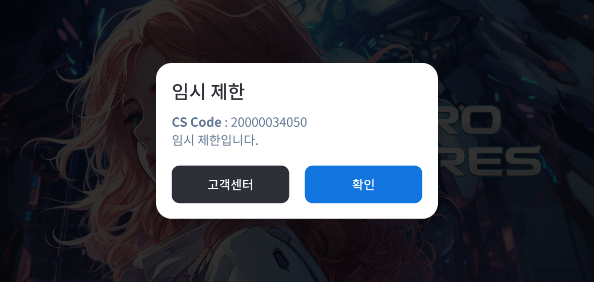 - 임시 제한 : CS Code와 함께 운영자가 입력한 타이틀과 메시지가 노출됩니다.