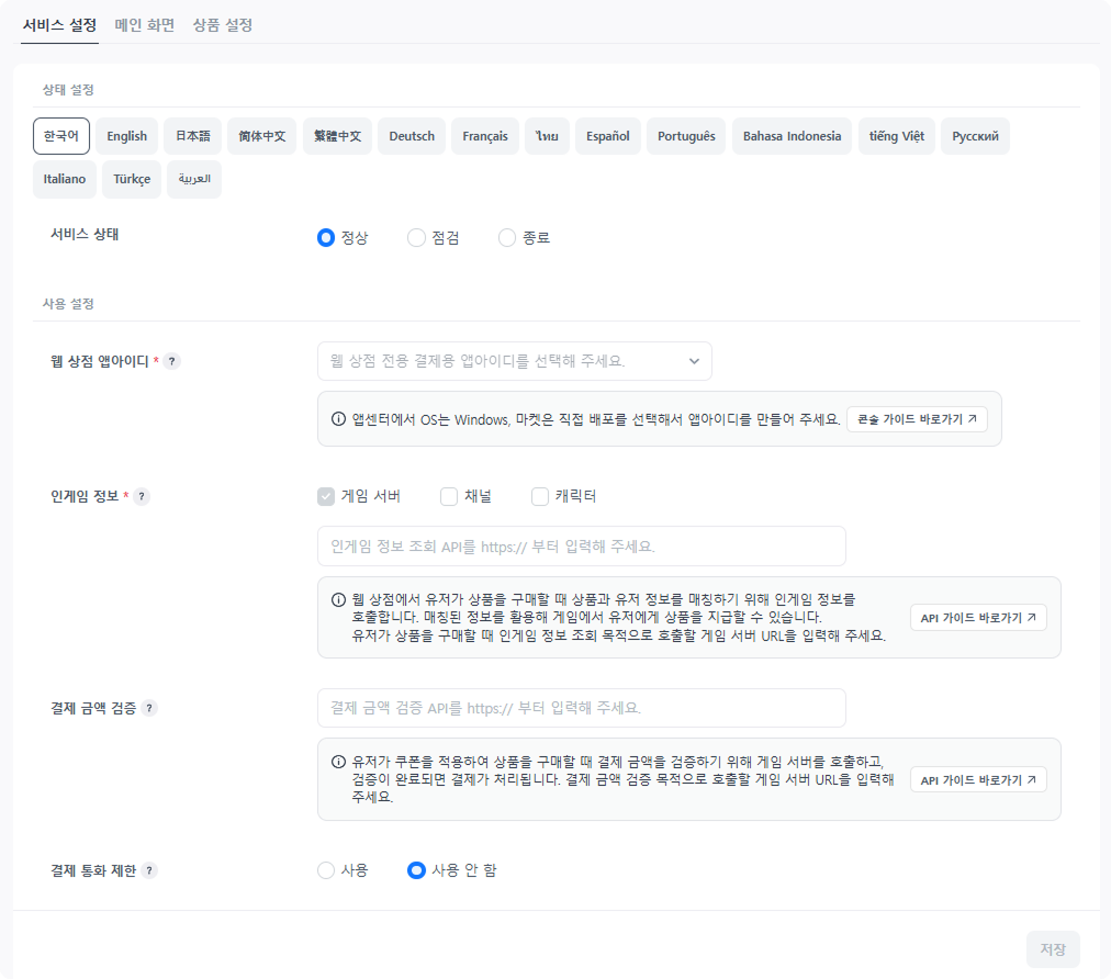 언어별 웹 상점의 서비스 상태를 변경할 수 있습니다.