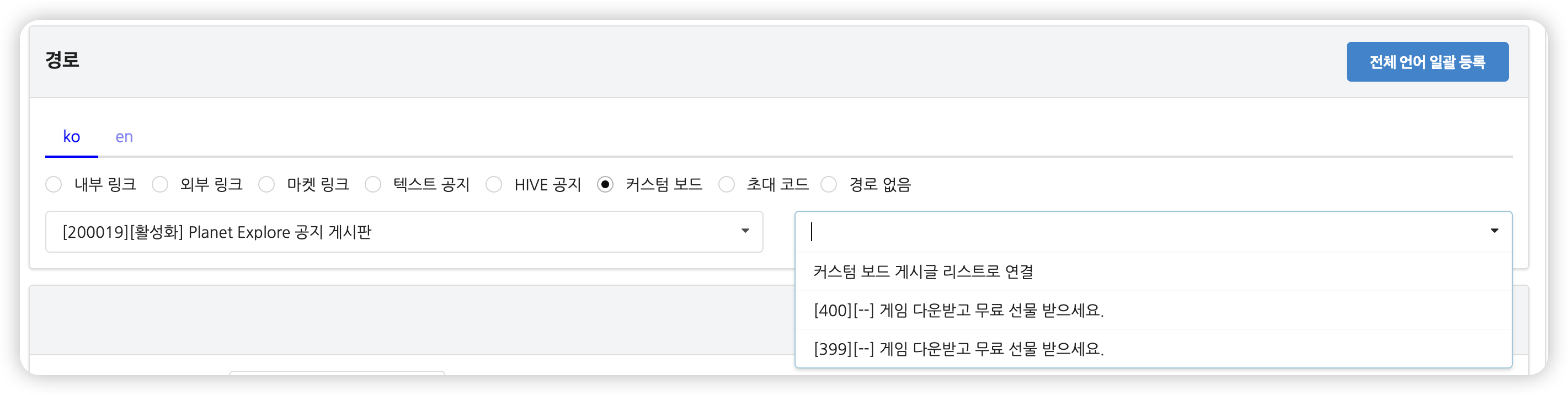 해당 게임 커스텀보드에 등록한 게시글이 항목으로 노출되며, 경로로 선택할 수 있습니다. 첫번째 드롭다운에서 보드를 선택하면, 두번째 드롭다운에서 해당 보드의 게시글을 선택합니다. 특정 게시글이 아닌 게시글 리스트로 연결하려면 '커스텀 보드 게시글 리스트로 연결'을 선택해 주세요.