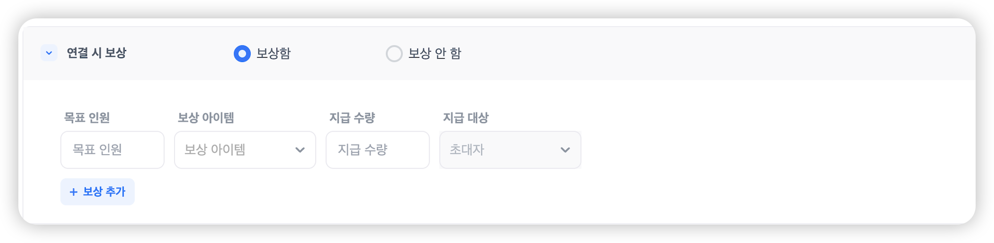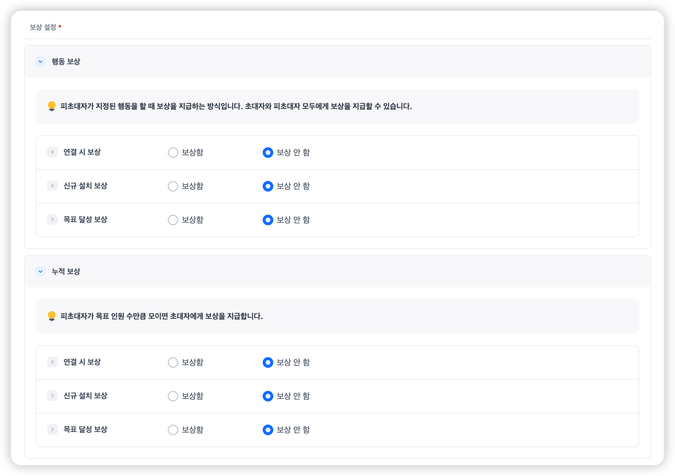 - 수락자의 경우 해당 설정값과 관계없이, 최초 1회에 한해서는 보상 지급이 가능합니다.