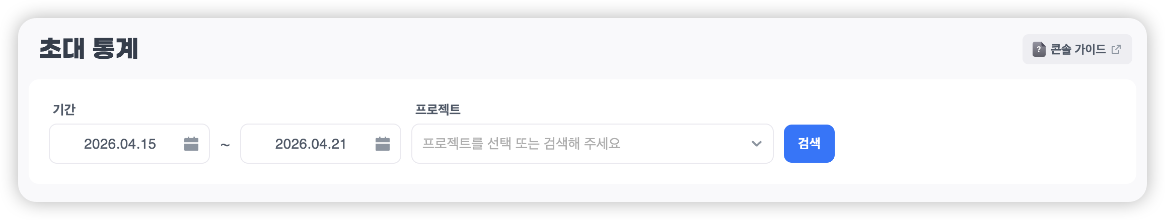 조회하고자 하는 기간과 프로젝트를 선택한 후 [검색] 버튼을 클릭하여 통계를 확인합니다.