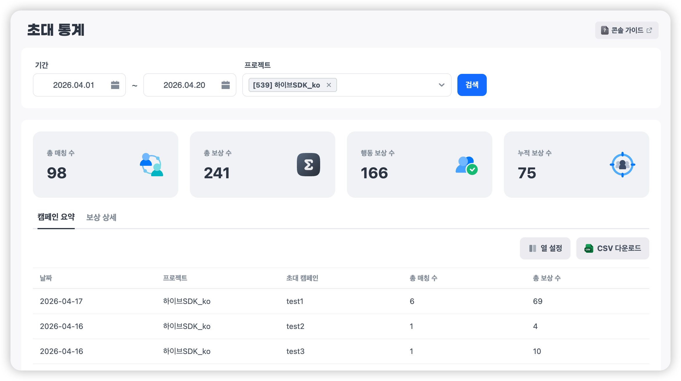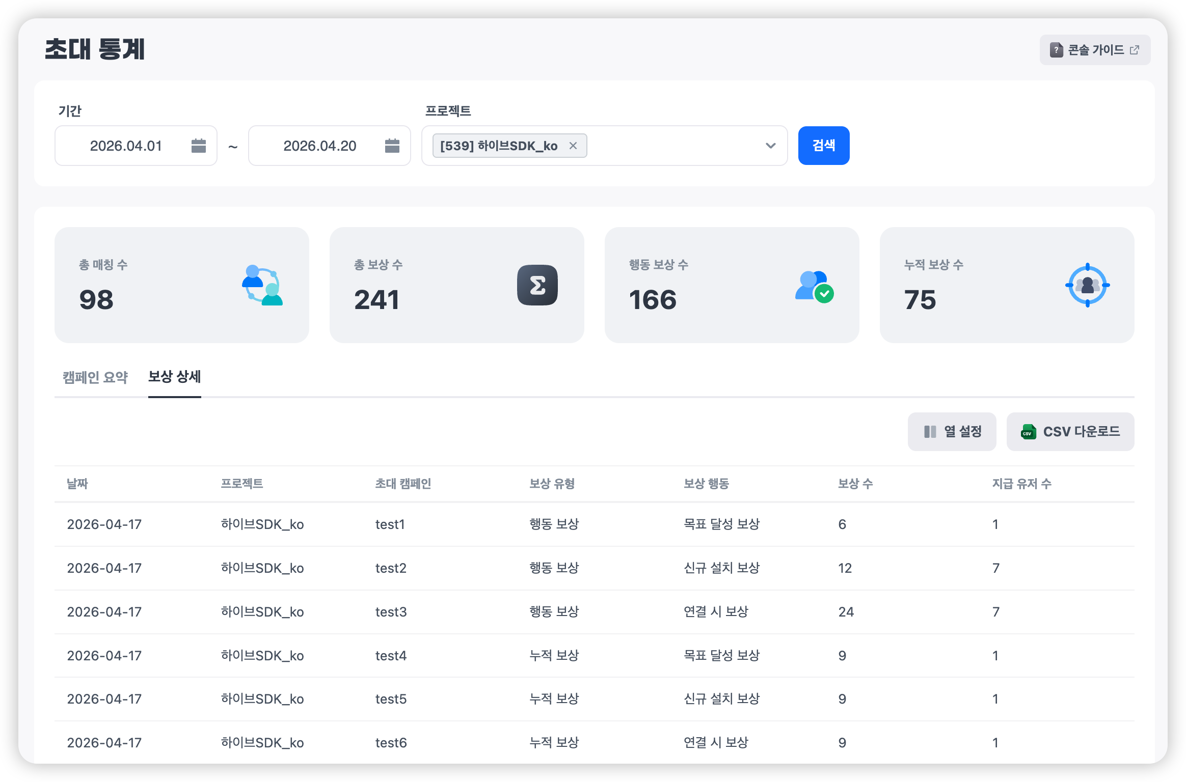 초대 코드 캠페인의 성과를 한눈에 확인할 수 있는 통계 페이지입니다. 기간 및 프로젝트를 기준으로 캠페인 성과를 조회하고, 매칭 및 보상 현황을 분석할 수 있습니다.