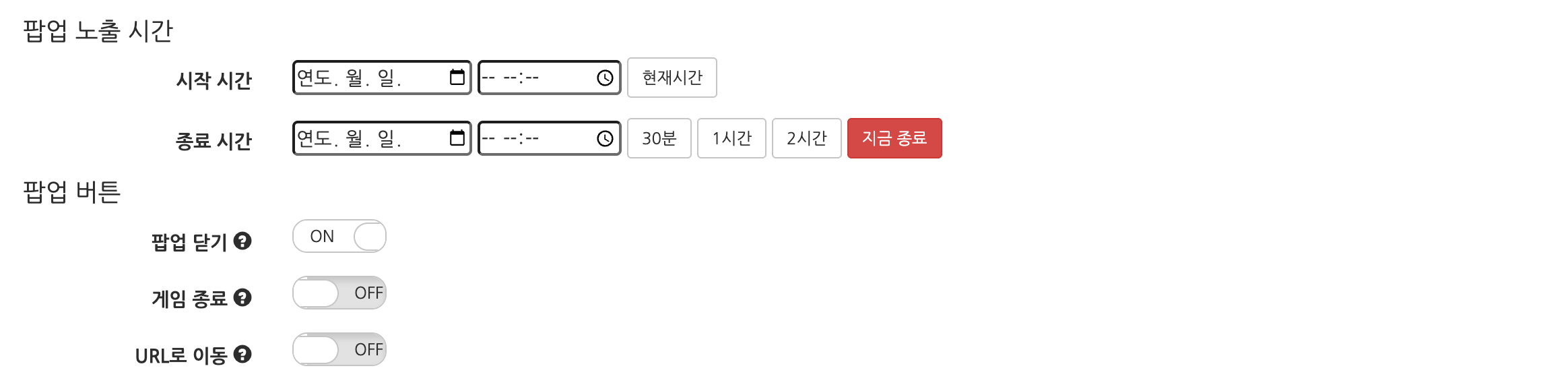- 시작 시간 (서버 점검이 시작되는 시각) : 팝업 노출이 시작되는 시각입니다. 현재 시간을 눌러 현재로 설정할 수 있습니다.
