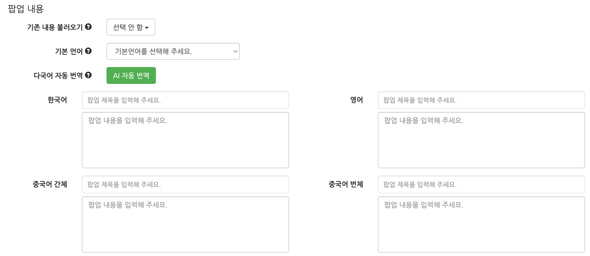 - 팝업 제목과 내용 입력 : 각 언어에 맞는 팝업 제목과 내용을 입력합니다. 기본 언어로 선택한 언어의 내용은 필수로 입력해야 합니다.