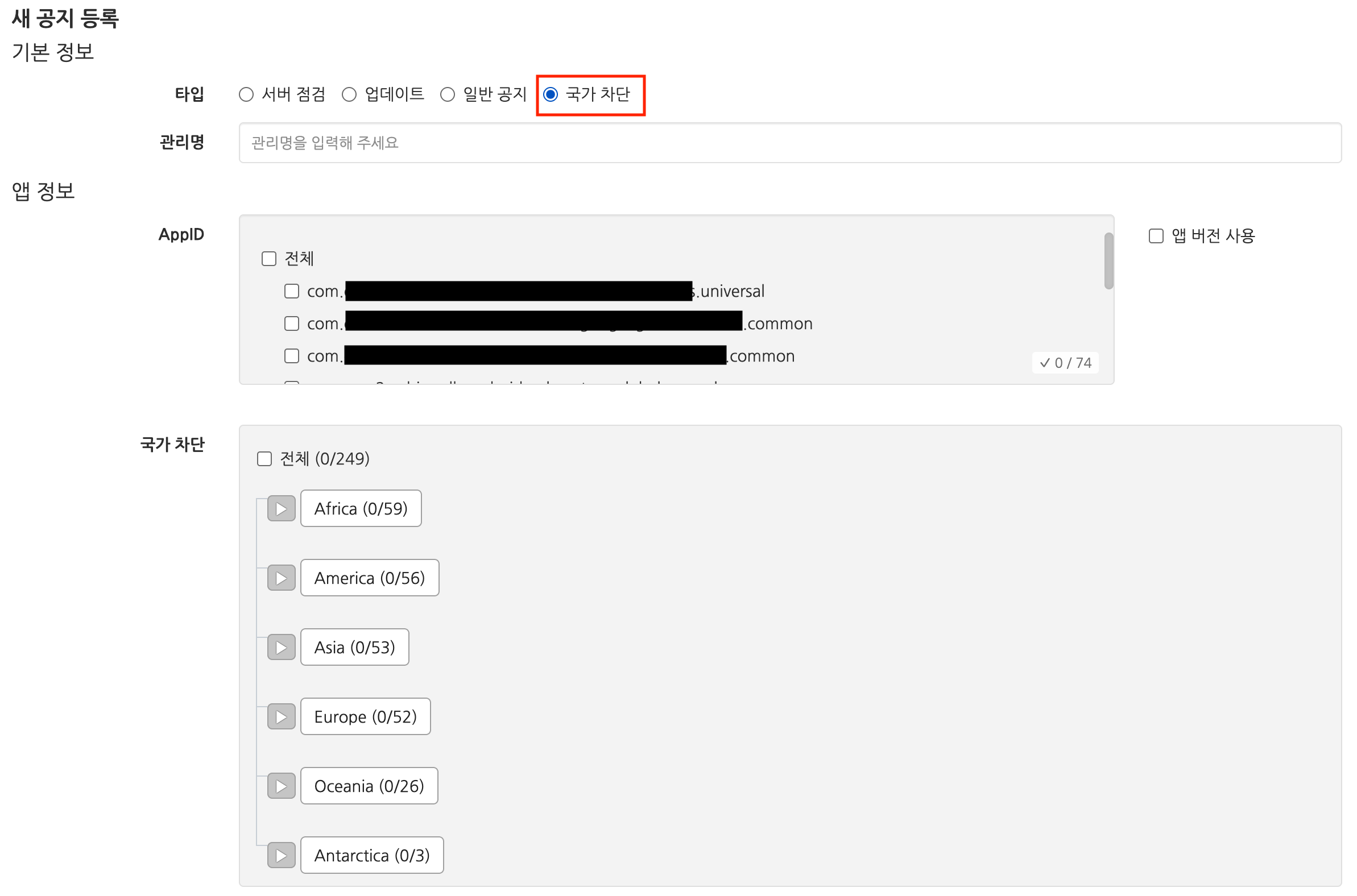 국가 차단 팝업은 팝업 타입을 국가 차단 으로 선택한 후 팝업을 노출할 AppID와 국가 를 선택합니다. ‘앱 버전 사용’을 체크하면 AppID에 해당하는 특정 앱 버전과 차단 국가를 선택할 수 있습니다.