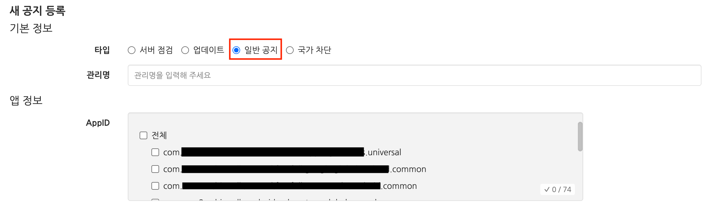 일반 공지 팝업은 팝업 타입을 일반 공지 로 선택한 후 팝업을 노출할 AppID 를 선택합니다. 그 외 기능은 다른 타입의 팝업과 동일합니다.