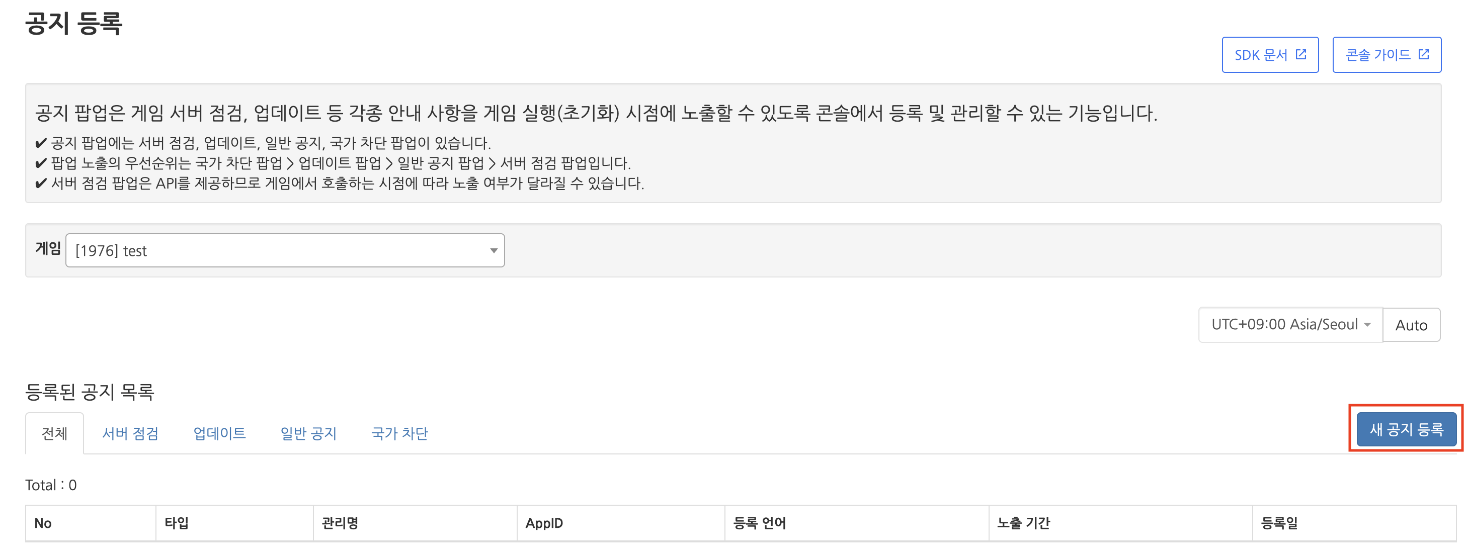 - Console의 팝업 공지 메뉴로 이동하여 새 팝업 등록을 클릭합니다.