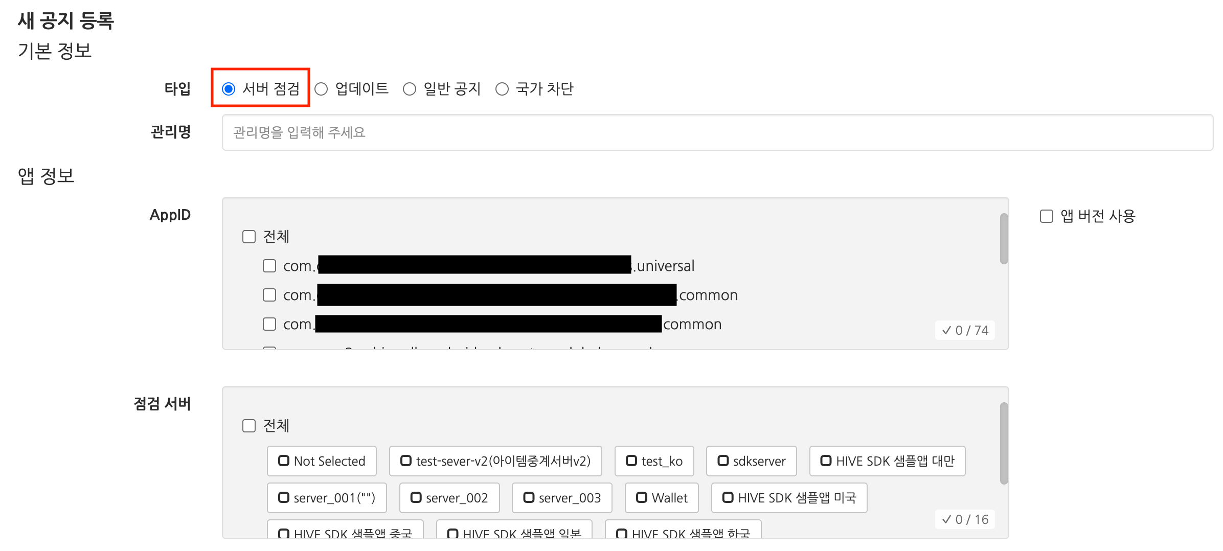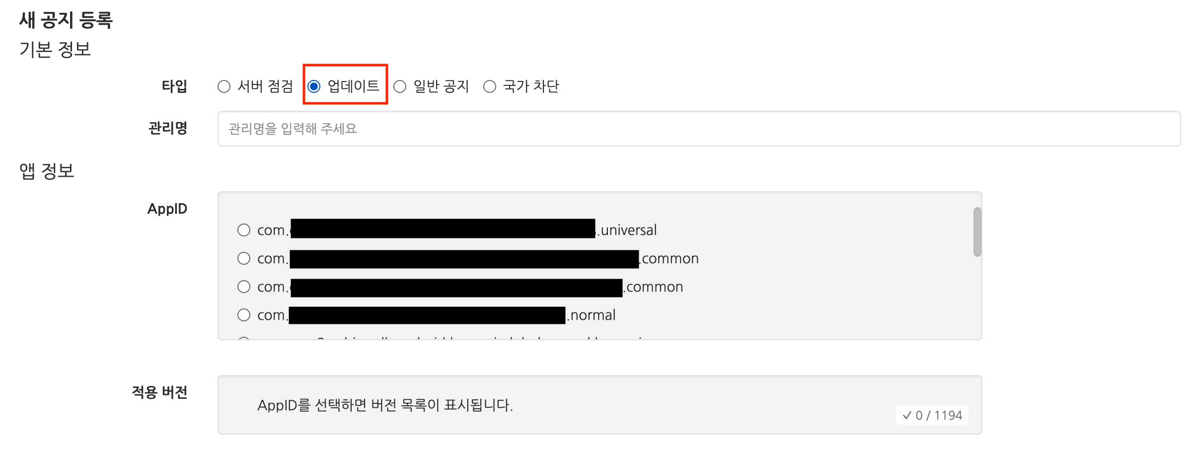 업데이트 팝업은 팝업 타입을 서버점검 으로 선택한 후 팝업을 노출할 AppID와 버전 선택합니다. AppID는 1개만 선택할 수 있으며 버전은 전체 또는 일부만 선택할 수 있습니다.