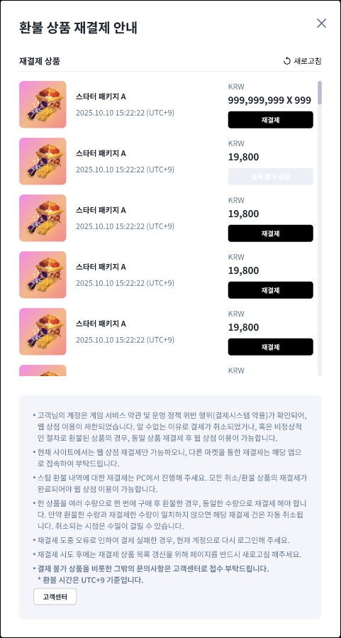 스팀 환불 내역에 대한 재결제는 PC에서 진행하세요. 모든 마켓의 취소/환불 상품의 재결제가 완료되어야 게임 이용이 가능합니다.\n\n일부 마켓에서 한 상품을 여러 수량으로 한 번에 구매 후 환불한 경우,