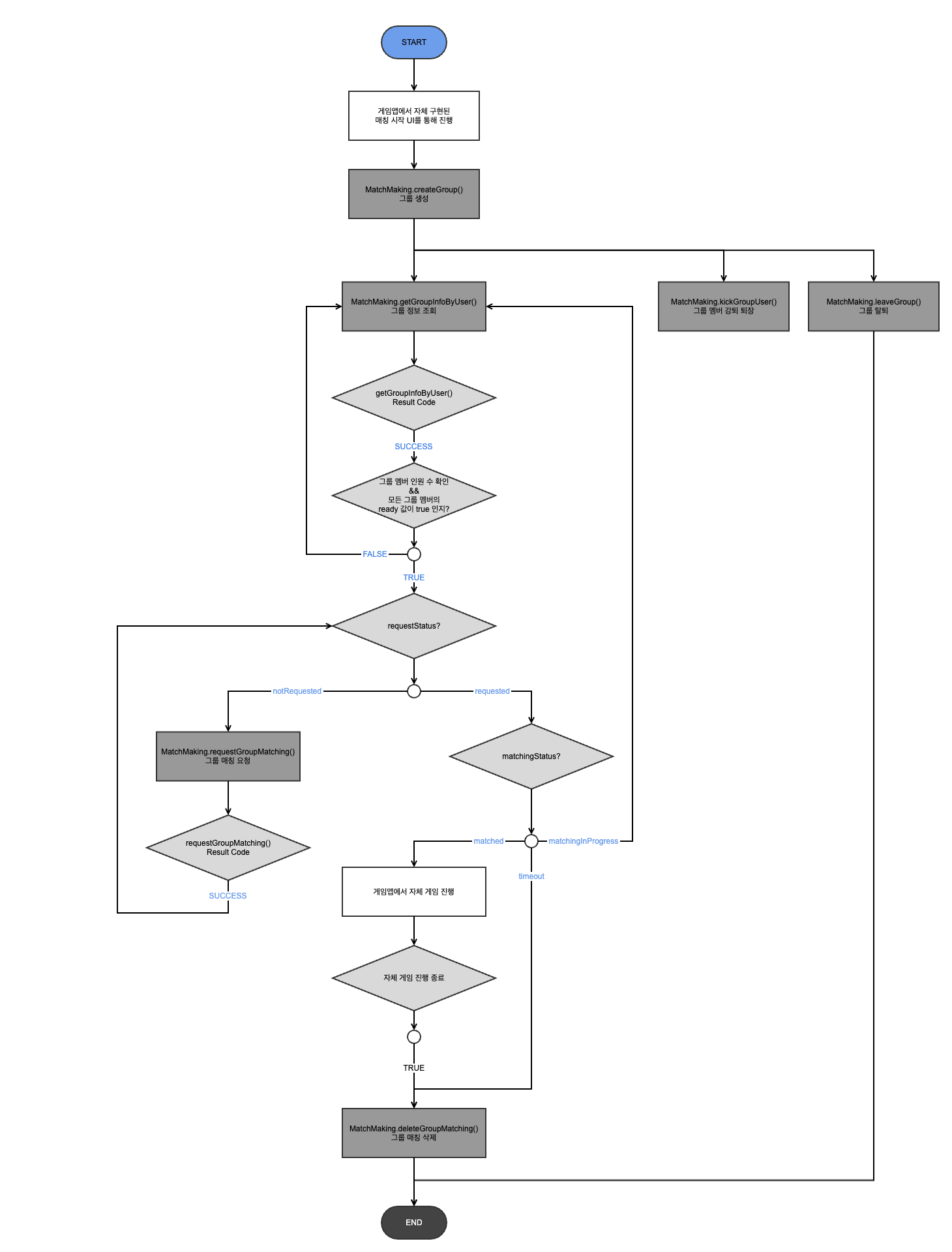 - 그룹(방) 생성 → 멤버 그룹 참여 → 매칭 요청
