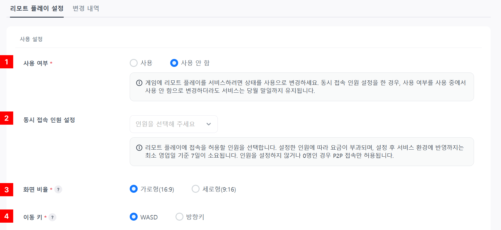 - 리모트 플레이의 서비스 여부를 설정합니다. 사용을 선택할 경우 리모트 플레이 사이트가 자동으로 생성됩니다.