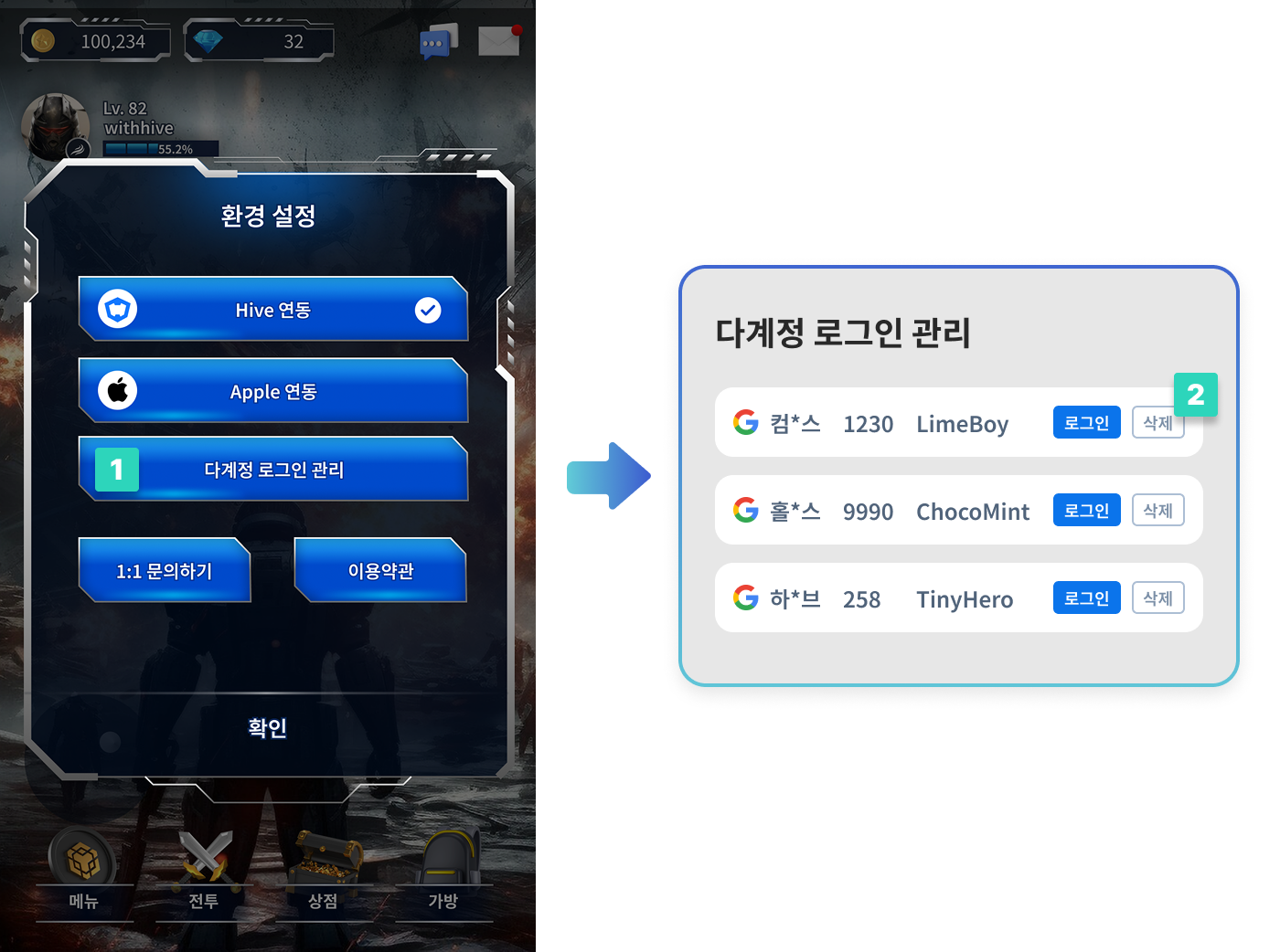 로그아웃 상태에서 다계정 로그인 관리 기능을 통해 저장된 계정(PlayerID)로 빠르게 로그인합니다.