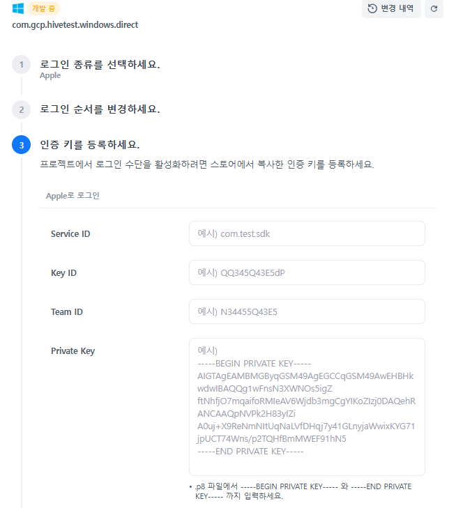 Apple로 로그인을 사용하려면 아래 내용을 참고하여 App Store Console에서 Service ID, Team ID, Key ID, Private Key를 확인하고 로그인 설정 메뉴에 등록하세요.