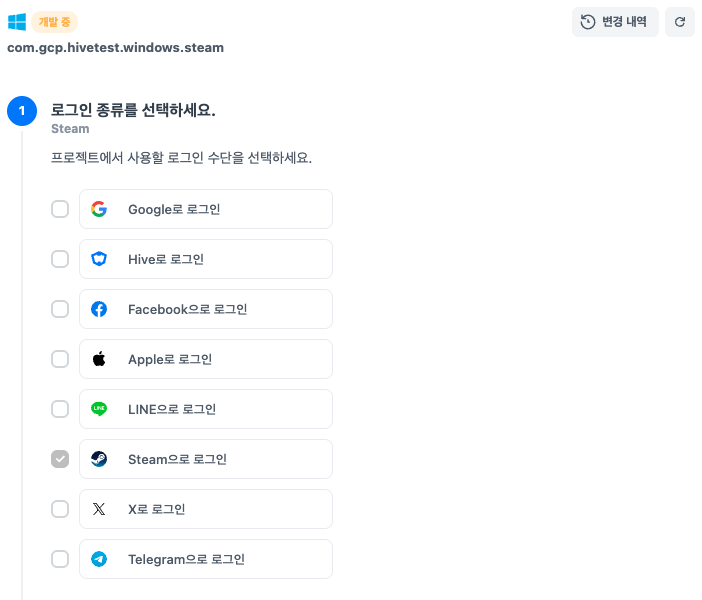 PC(Windows, MacOS)에서 사용할 수 있는 IdP는 Hive, Google, Facebook, Apple, Line, X, Telegram입니다. 만약 앱아이디가 앱센터에 Steam 마켓으로 설정된 경우, 'Steam으로 로그인'이 필수로 활성화됩니다.