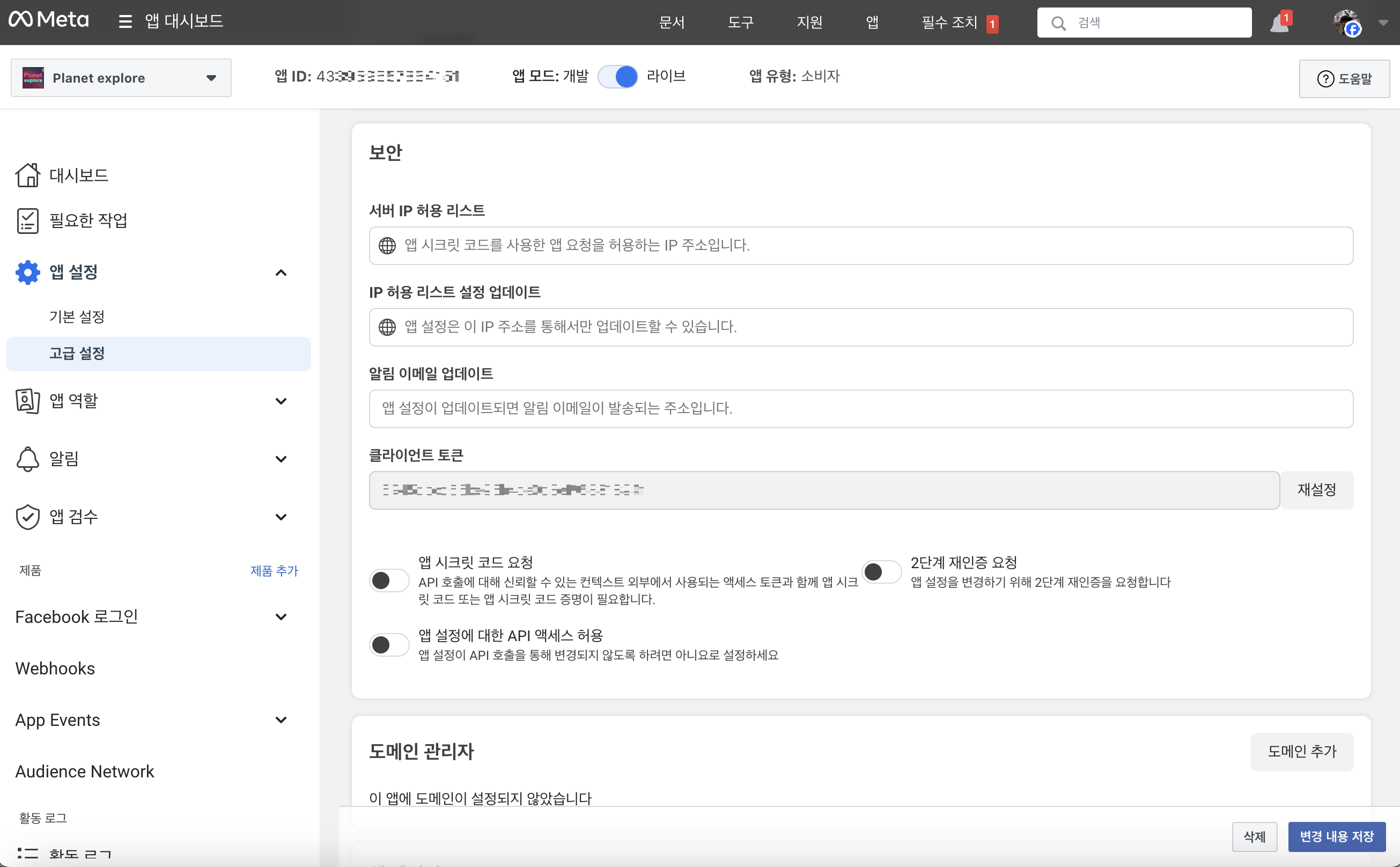 - 앱 설정 페이지에서 앱 ID와 앱 시크릿 코드 확인