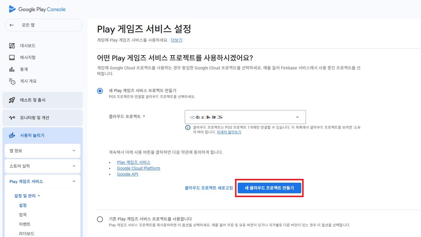 Google Play Console에서 Play 게임즈 서비스 설정에서 클라우드 프로젝트 설정