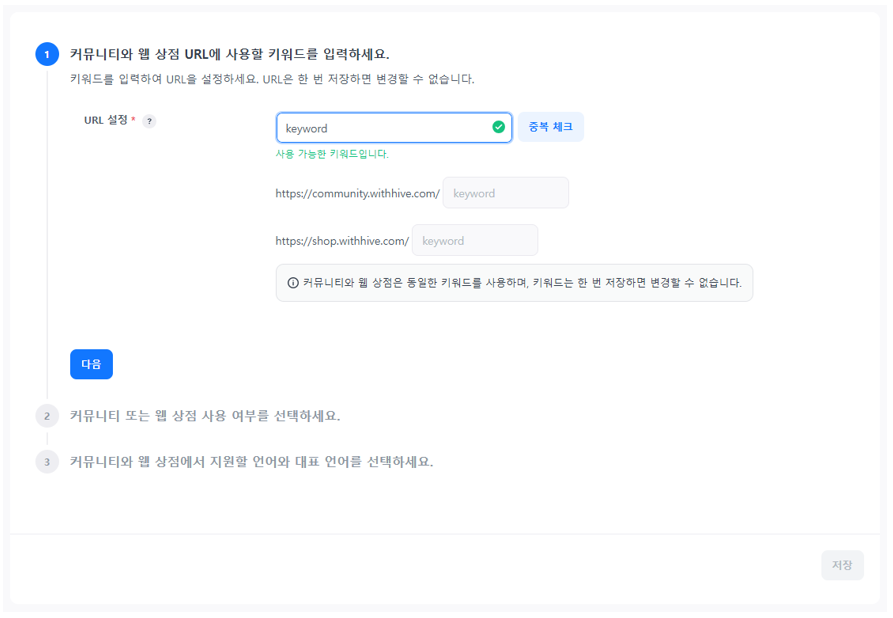4. 커뮤니티와 웹 상점 URL에 사용할 키워드를 입력하세요. 커뮤니티와 웹 상점은 동일한 키워드를 사용하며, 키워드는 한 번 저장하면 변경할 수 없습니다.
