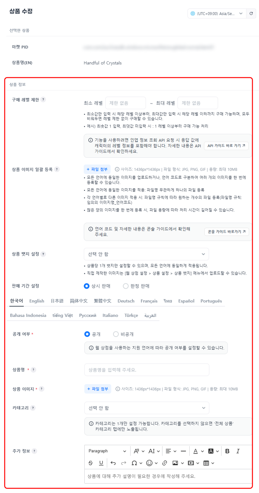 화면 오른쪽 상단에서 상품 관리 및 설정을 위해 표시될 시간대(타임존)을 변경할 수 있습니다. 현재 화면에서 표시되는 시간이 선택한 타임존 기준으로 변경됩니다. 현재 화면(상품 수정)에 있는 시간 설정 기능에 선택한 타임존으로 적용됩니다.