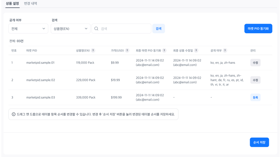 • 웹 상점은 빌링 메뉴에 등록된 상품 목록을 동기화해 상품을 관리합니다. 웹 상점에서 상품을 관리하려면 빌링 메뉴에서 마켓 PID를 필수로 등록해야 합니다. 빌링 > 인 앱 결제 > 마켓 PID 등록에서 설정을 완료해 주세요.