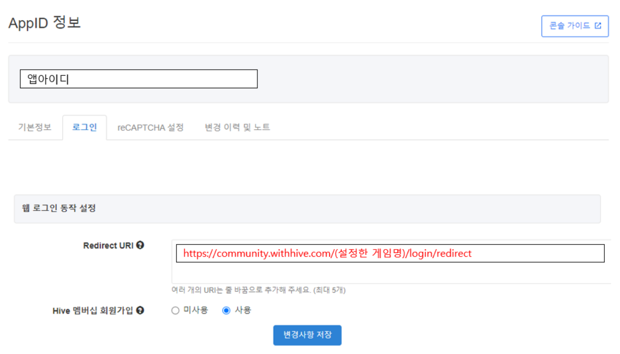 • 로그인 > 웹 로그인 > Redirect URI와 동일한 게임명 사용