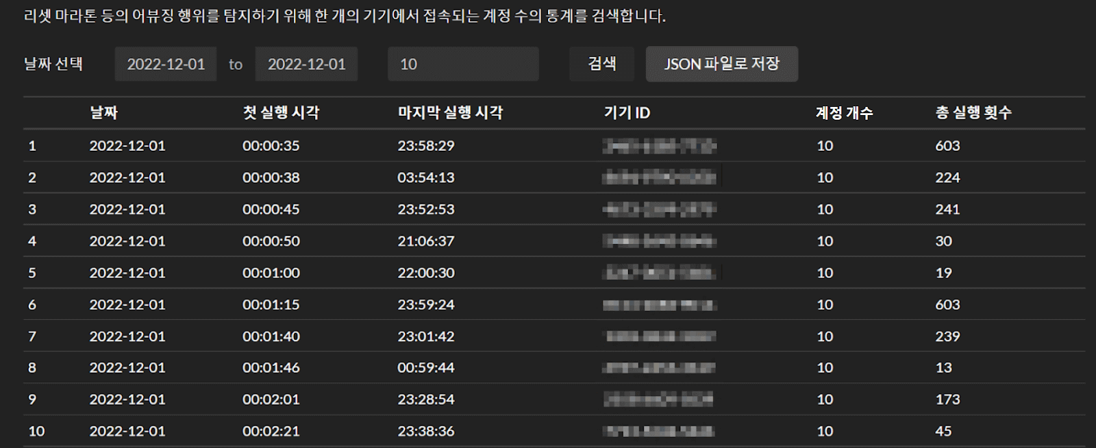 해당 기기 ID에서 계정을 여러 번 변경하여 접속하는 다중 아이디 사용 유저를 확인할 수 있으며 이를 토대로 리셋 마라톤(reroll)을 하는 행위를 적발할 수도 있습니다.