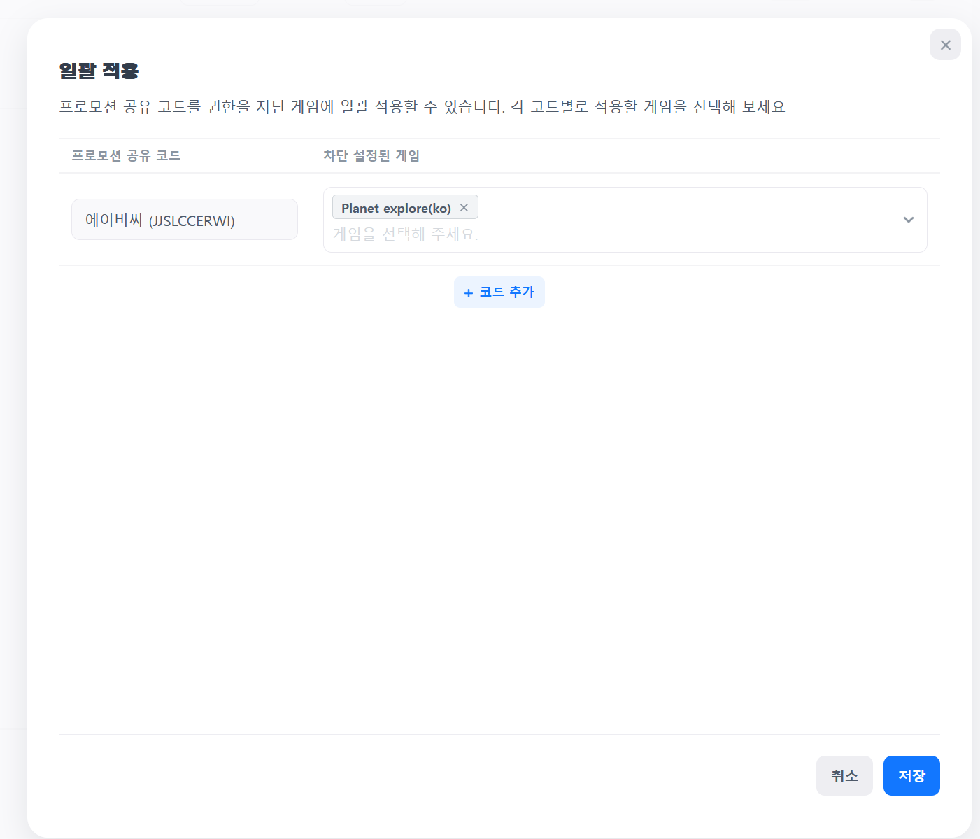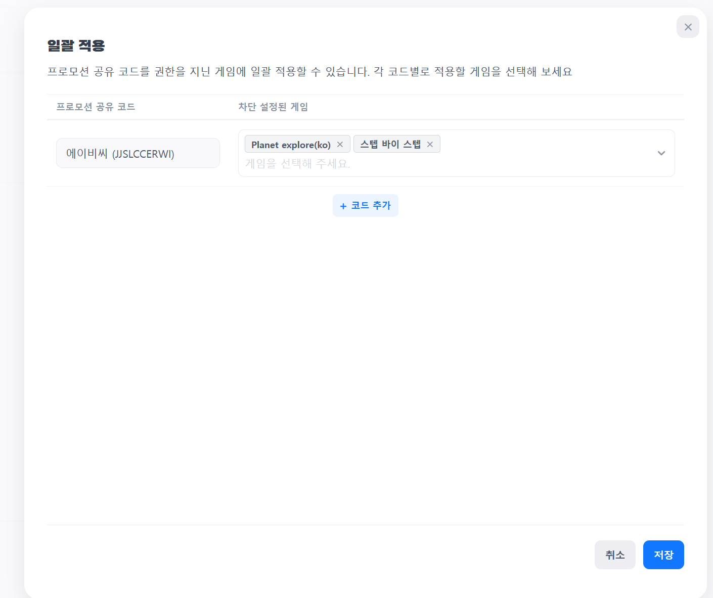 여러 게임을 관리하고 동일한 프로모션 공유 코드를 입력해야 할 경우, 모든 게임의 수익화 설정에 진입하여 코드를 입력해야 합니다. 일괄 적용 기능을 이용하여, 내가 권한을 가진 모든 게임에 프로모션 공유 코드를 한번에 적용할 수 있습니다. 여러 게임에 동시에 차단 코드를 입력하시려면 차단 코드 입력란 옆에있는 '일괄 적용' 버튼을 클릭합니다.
