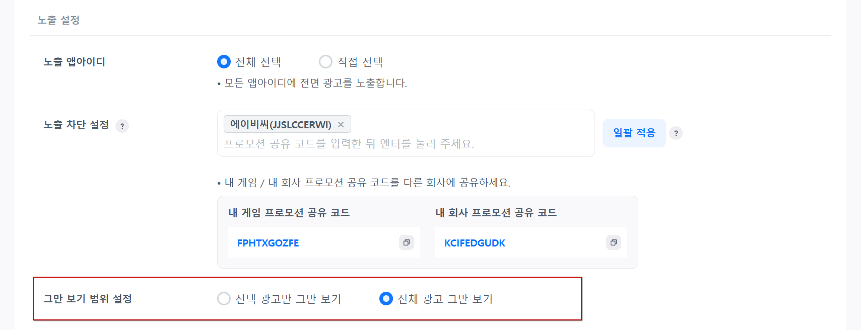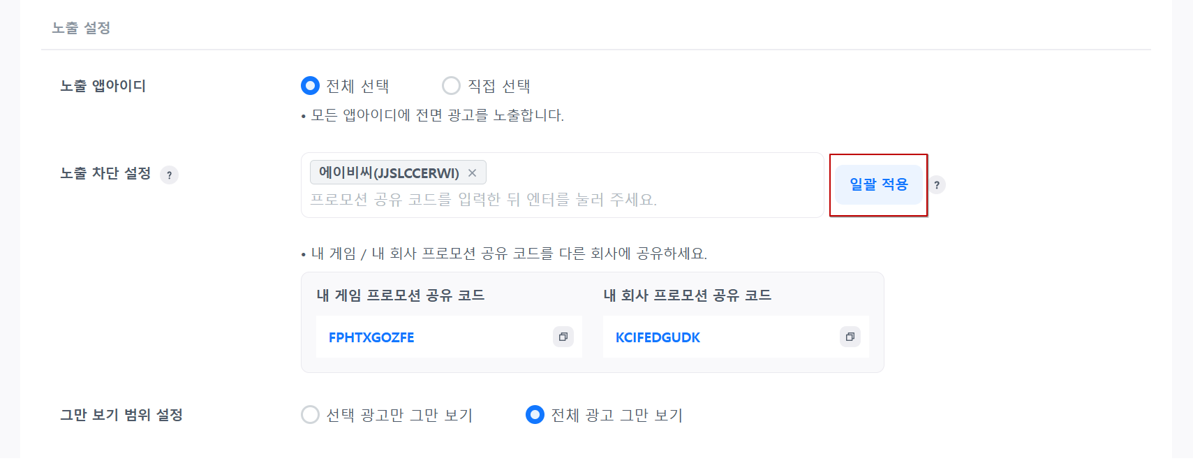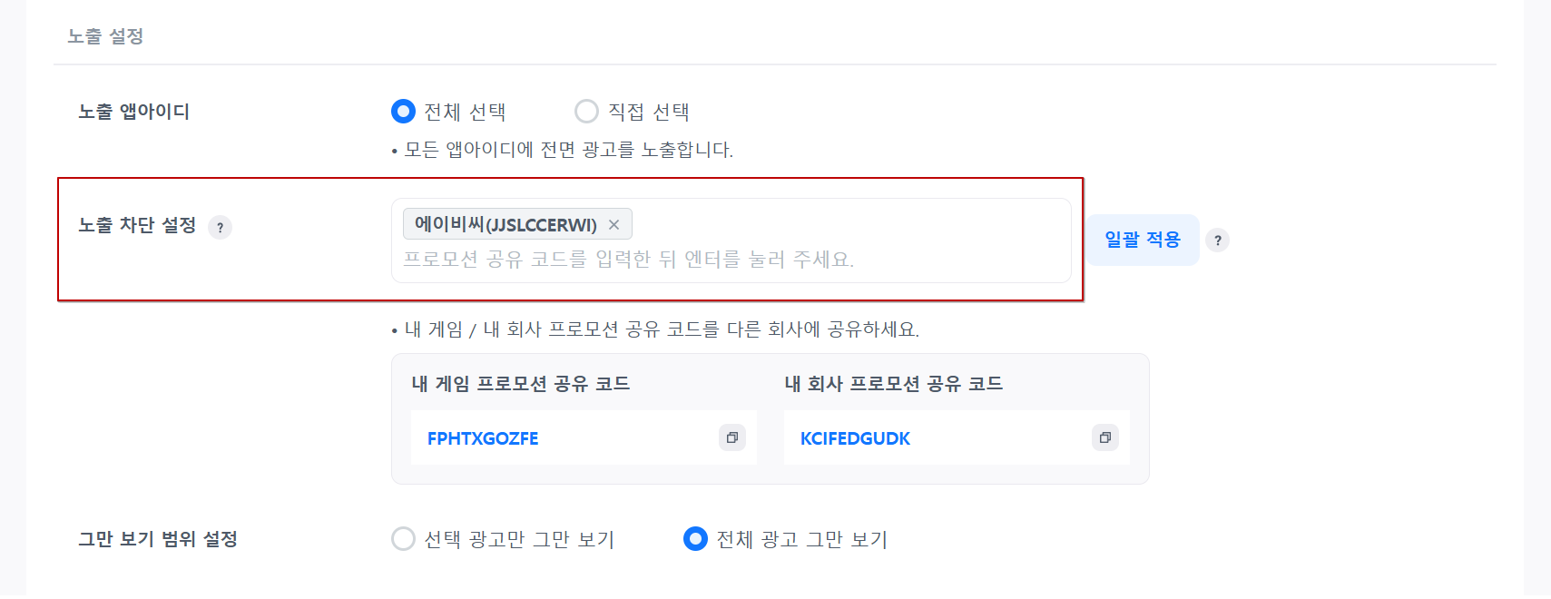 특정 회사 및 게임을 차단할 수 있는 기능입니다. 차단하려는 회사,게임의 프로모션 공유 코드를 입력해주세요. 정책상 내 회사 게임이라도 광고를 노출할 수 없다면 차단 설정에 게임 코드를 입력하여 광고 노출을 하지 못하도록 설정할 수 있습니다.