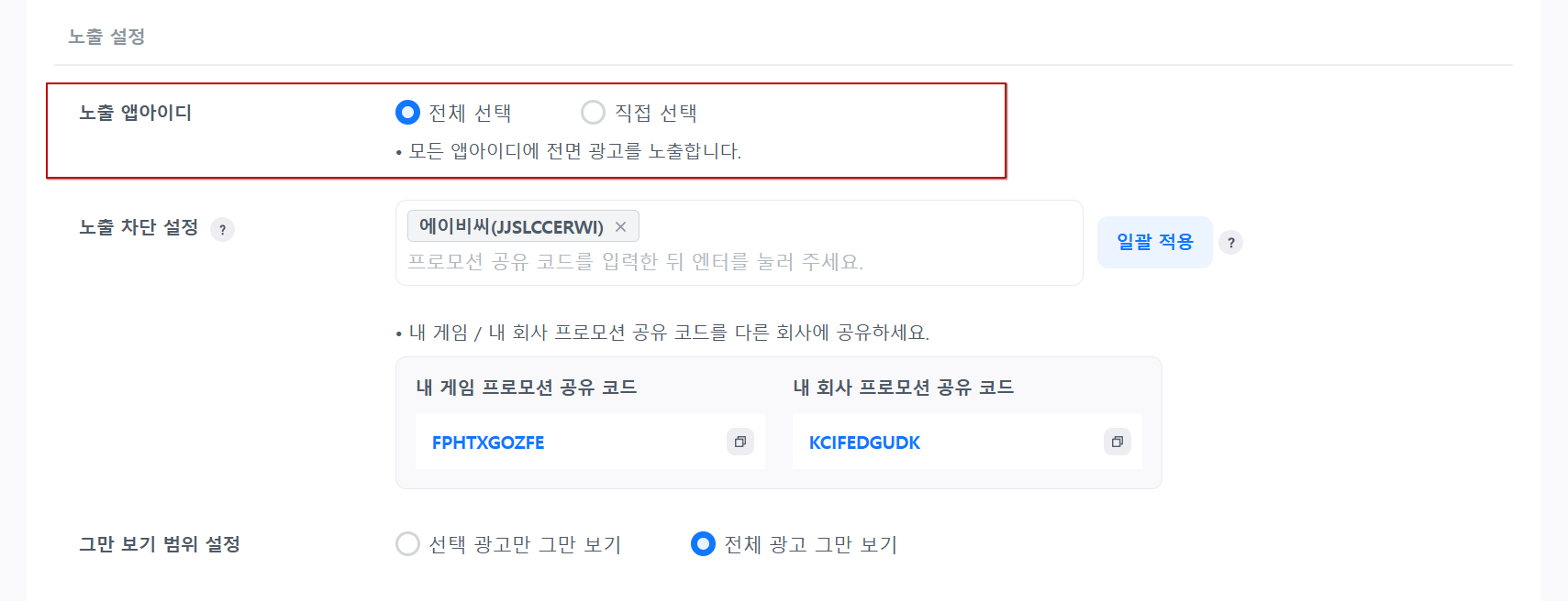 - 전체 선택인 경우, 모든 앱아이디에서 크로스 프로모션 광고를 노출할 수 있습니다.