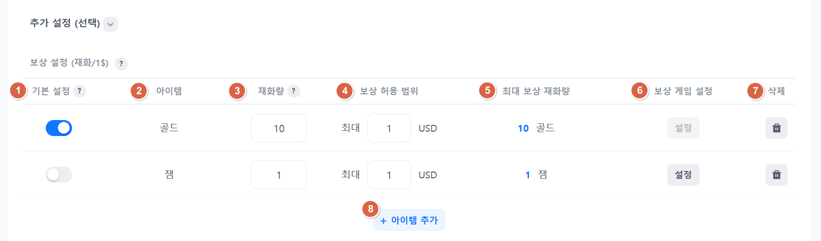 - 재화량 : 보상할 아이템을 기준으로 1 USD에 해당하는 재화량을 입력합니다.