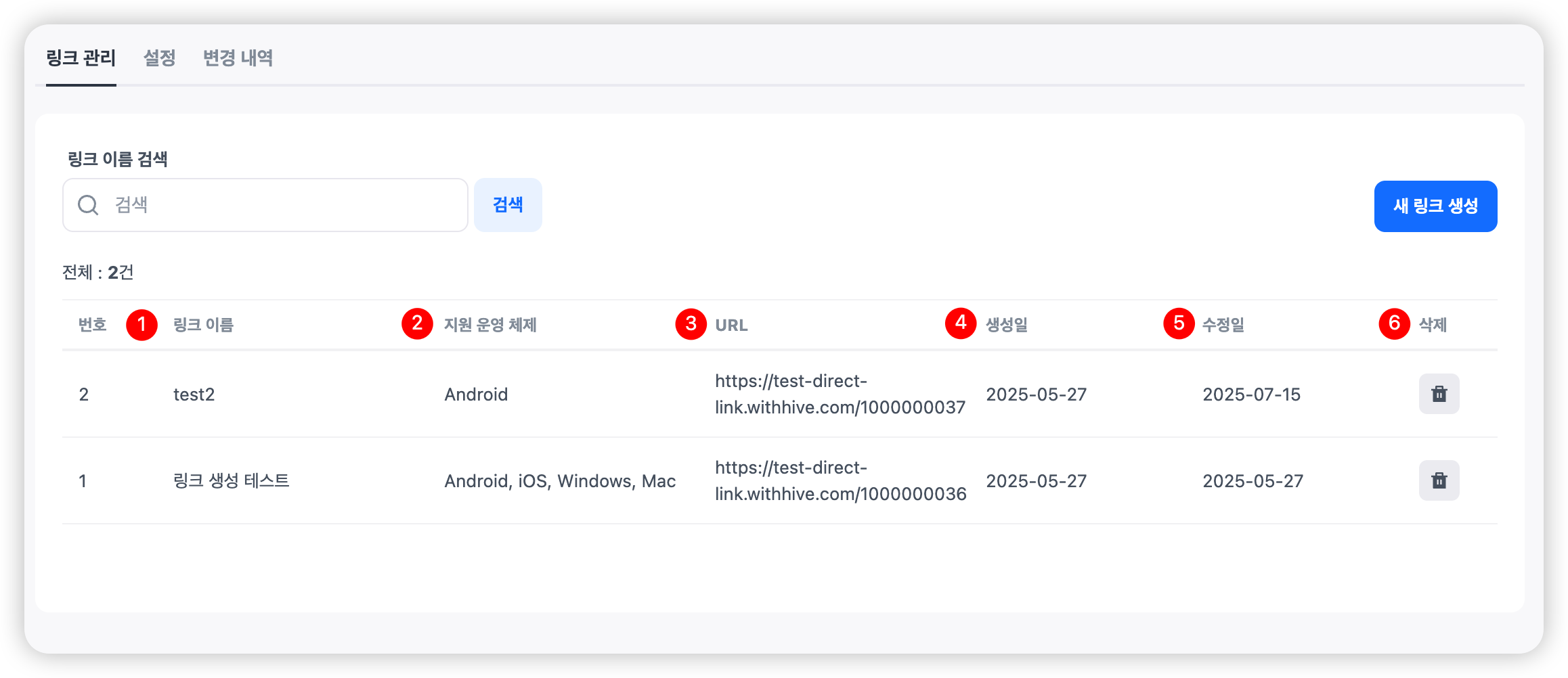 - 링크 이름: 콘솔에서 관리하는 링크 이름입니다. 클릭 시 수정 페이지로 이동합니다.