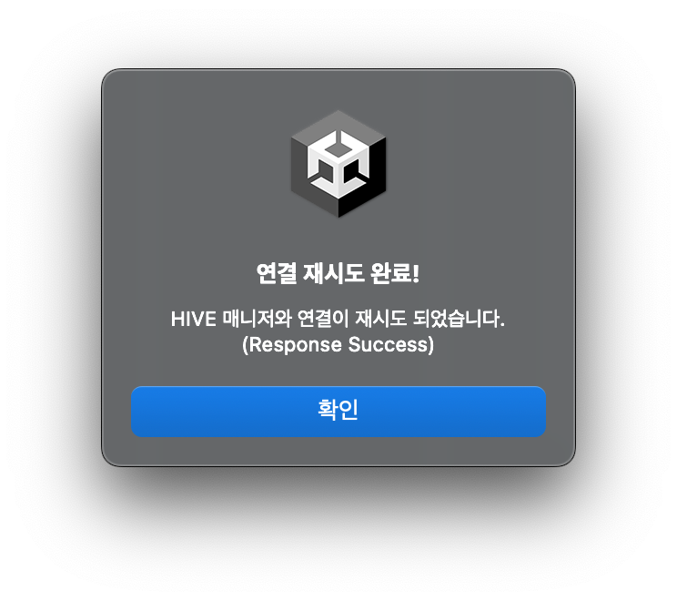 네트워크 연결이 원활하지 않아 SDK Manager 메뉴가 비활성화 상태인 경우, Unity 상단 메뉴에서 Hive > HIVE SDK Manager > Retry to connect HIVE Manager 를 클릭하세요. Hive 매니저와 연결을 다시 시도합니다. Hive 매니저와의 연결이 성공하면 서버의 갱신 정보로 매니저 내부 정보를 업데이트 합니다.